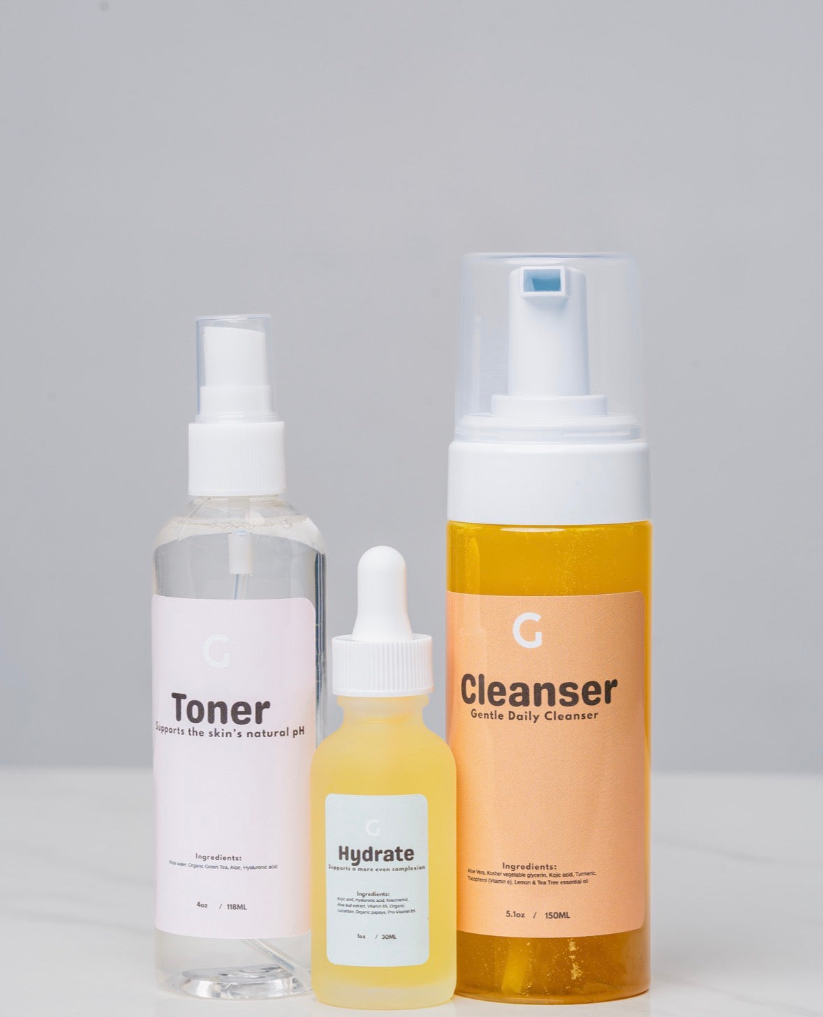 At the heart of this routine is our calming Turmeric Cleanser, paired with a soothing botanical toner and a deeply hydrating, multi-benefit serum. Each step works in harmony to simplify your routine while delivering visible results.